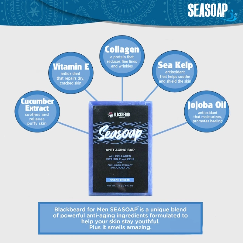 - One 6.17-oz bar of Blackbeard for Men Seasoap, our own hydrating, luxury age-defying bar soap with collagen, sea kelp, vitamin E, and powerful moisturizers jojoba oil and cucumber extract to help your skin look younger and fight back against the ravages of time. Ready for the ultimate bathing experience? Long-lasting, refreshing Seasoap: fights aging. Smells amazing.